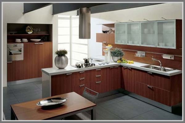 Pada desain ruang dapur ini bahan utama pembuatannya adalah dari kayu. Hampir 90% elemen-elemen dan komponennya dibuat dengan kayu. Akan tetapi Anda harus bisa memilah dan memilih jenis bahan kayu yang bagus dan solid sehingga akan didapatkan kualitas yang perfect. Biasanya jenis kayu yang bagus nomor satu yaitu kayu jati.