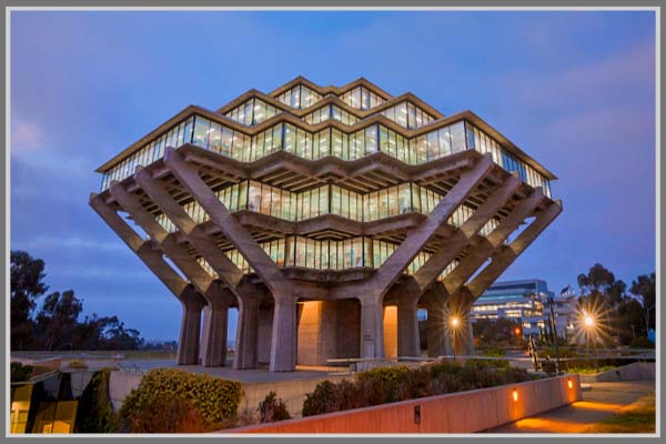 Dirancang pada tahun 1960 oleh William Pereira, University of California memiliki gedung perpustakaan geometris yang bernama Geisel library untuk menghormati Audrey dan Theodor Geisel (dikenal sebagai Dr Seuss) pada tahun 1995. Perpustakaan tersebut mempunyai lebih dari setengah juta item, termasuk buku, majalah dengan berbagai alat referensi dan sumber daya digital seperti ARTstor (gambar) dan Database Tercatat American Music (streaming audio).