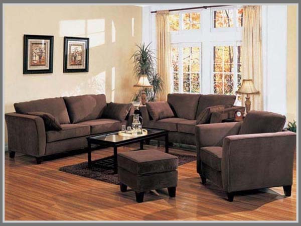 Selanjutnya, Anda bisa bermain menggunakan warna coklat. Pilihlah gradasi warna coklat tua untuk memunculkan kesan hangat yang maskulin di ruang tamu. Hadirkan warna coklat tua yaitu pada sofa, meja, dan kap lampu. Untuk gaya maskulin yang kental, jangan menggunakan banyak bantal pada sofa.